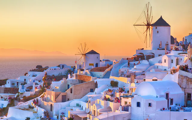 Santorini is a picturesque island in the Aegean Sea, part of Greece’s Cyclades group. Known for its white-washed buildings with blue domes, Santorini sits on cliffs overlooking a volcanic calder...